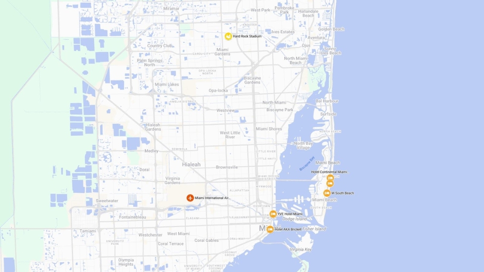 Explore Miami’s stadium routes, airports, and top hotel areas through our interactive map – designed to make your trip planning effortless.